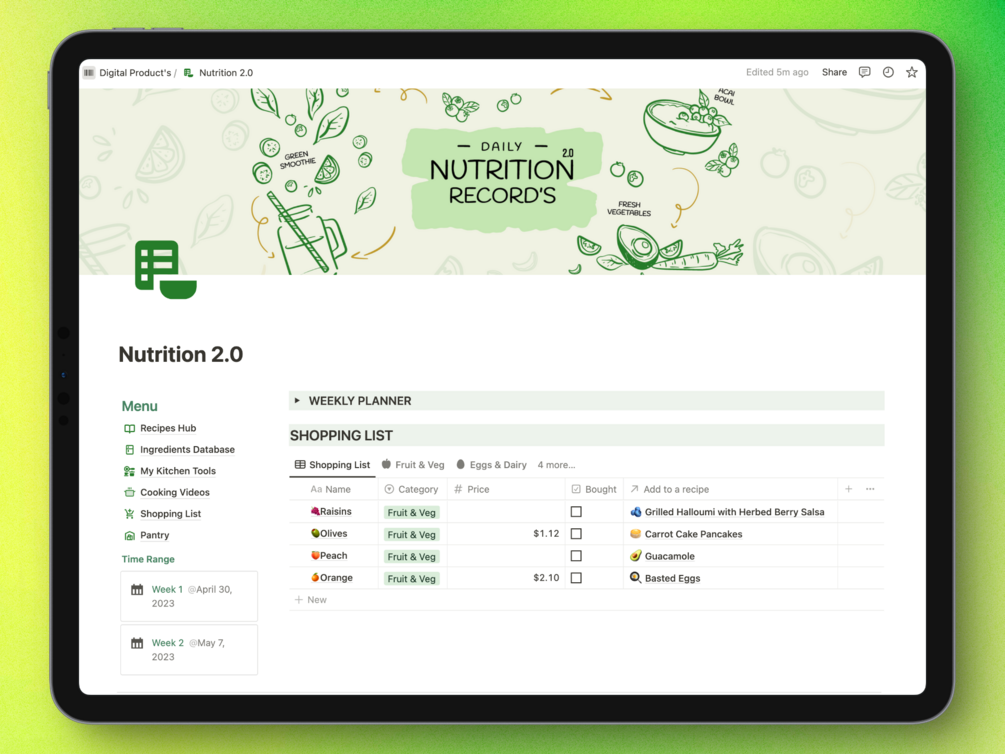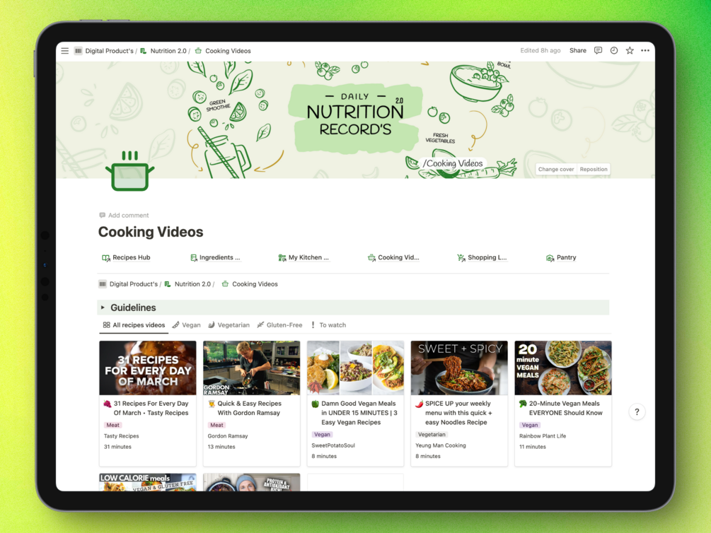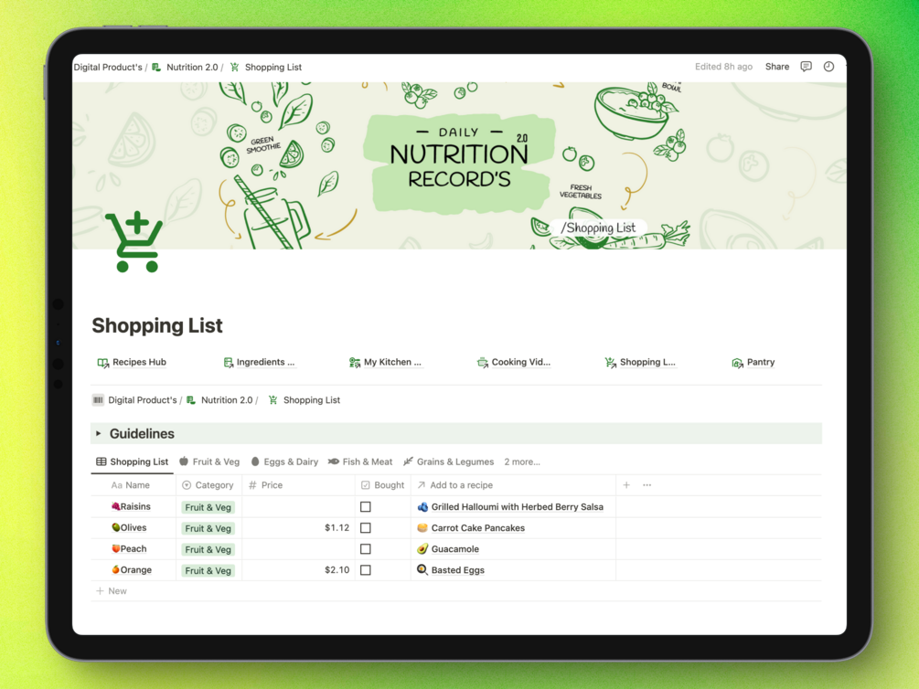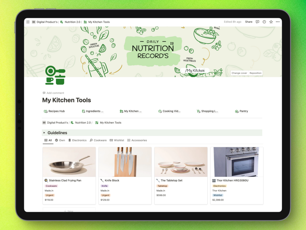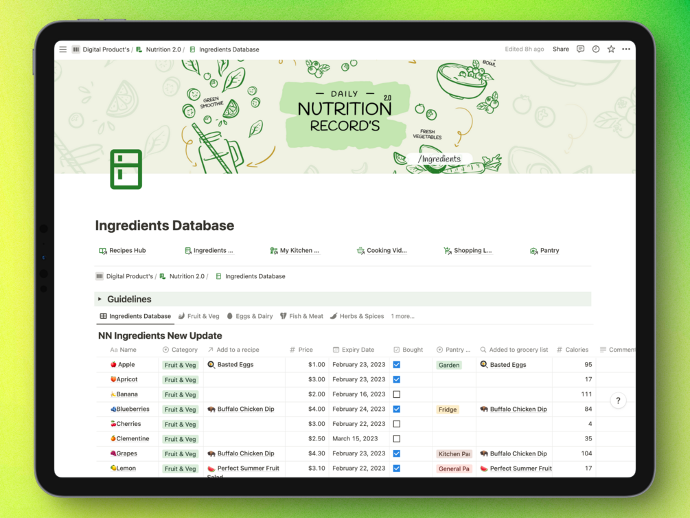 Discover a fusion of flavor and functionality with Nutrition 2.0, the ultimate companion for your nutrition journey. The free Recipe Gallery template offers an appetizing assortment of recipes, igniting your culinary imagination and encouraging healthy eating habits. For those seeking the pinnacle of meal planning, Nutrition 2.0 presents an all-encompassing package. Harness the power of the Recipe Gallery alongside the Ingredients Database, My Kitchen Tools, Cooking Videos, Shopping List, and Pantry. Seamlessly integrate flavor, nutrition, and organization into your kitchen routine. Unleash your inner chef, master new techniques, and create harmonious meals that nourish both body and soul. Upgrade to Nutrition 2.0 now and unlock the full potential of your culinary creativity!